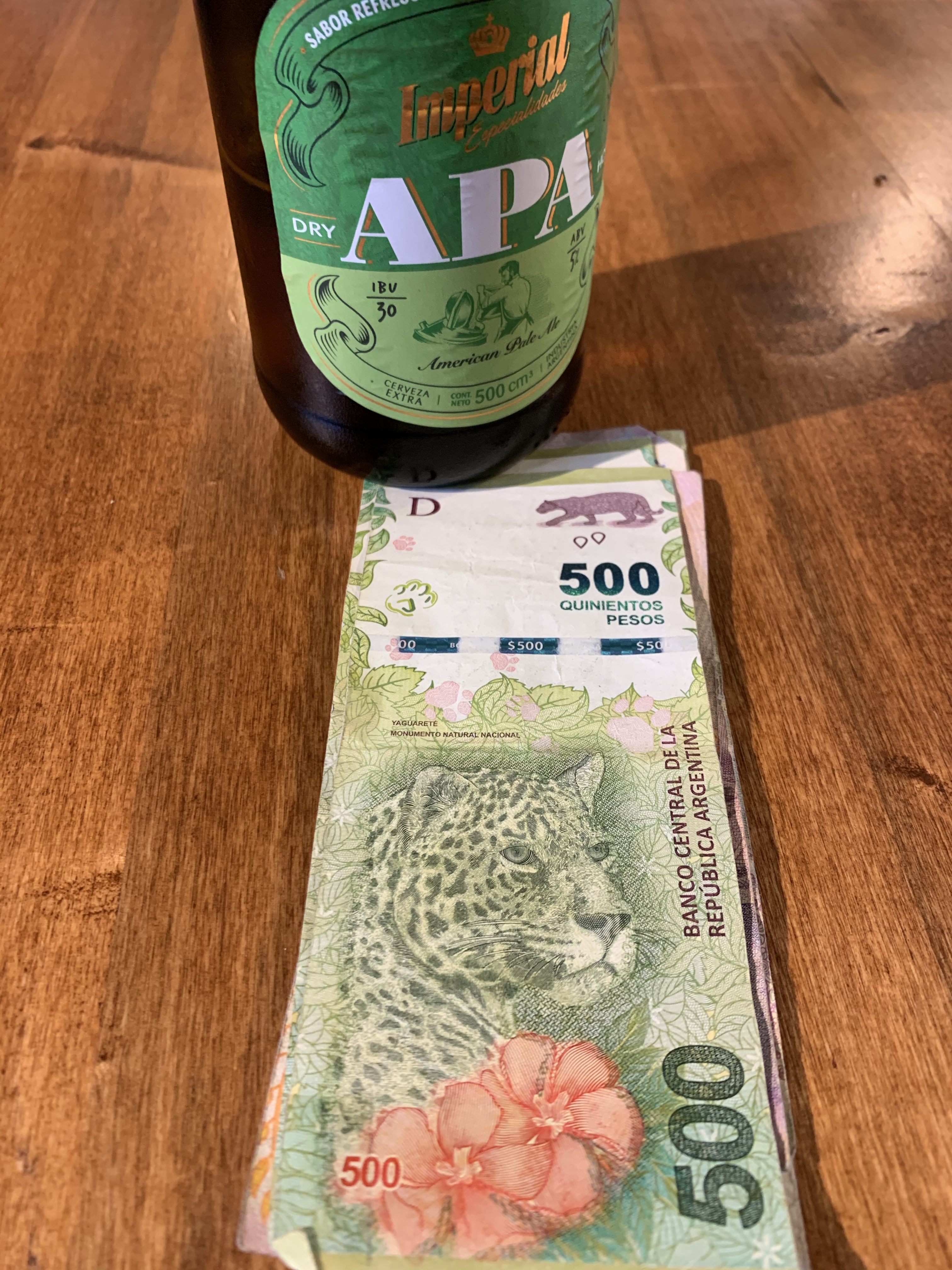Rétt í þessu var ég að kaupa mér einn stóran bjór eftir göngutúr í góðu veðri hérna og hann kostaði 140 ARS eða ca 290 krónur íslenskar.